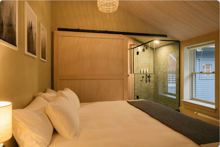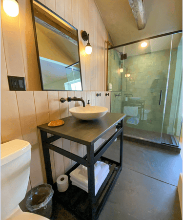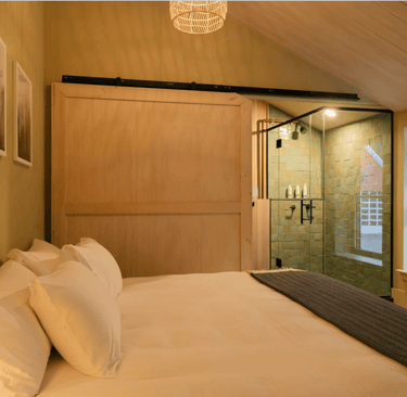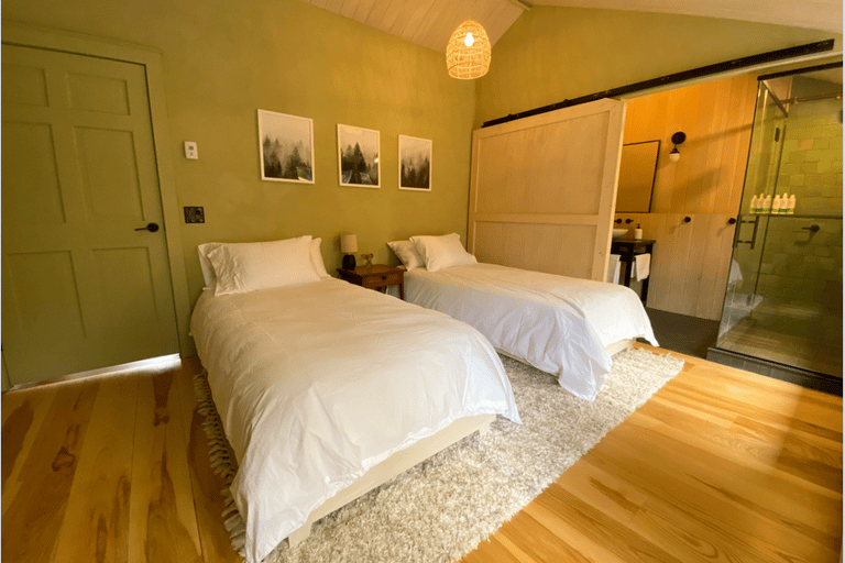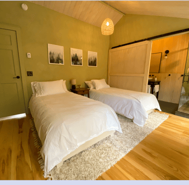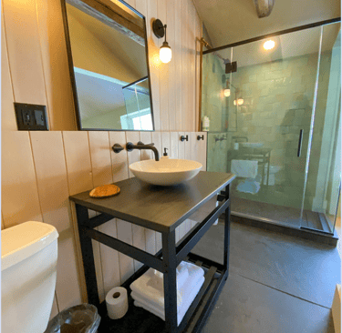 Western views and cooler lime washed tones give Ash a cozy, protected feel. The attached en suite bathroom has a full glass shower open to the room, or covered by the sliding barn door. Your choice. Large slab slate and Douglas fir walls bring the presence of nature into the room while your views compliment the feeling.